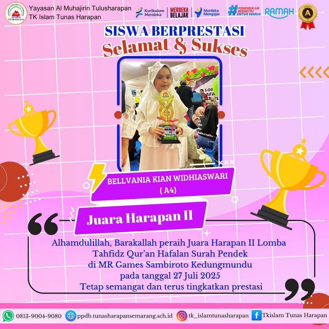 Kabar membanggakan datang dari TK Islam Tunas Harapan, Semarang. Salah satu siswi terbaiknya, Bellva...